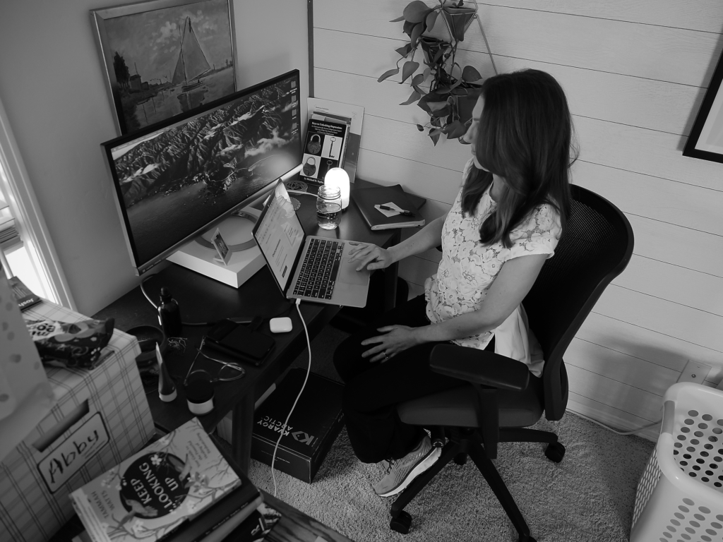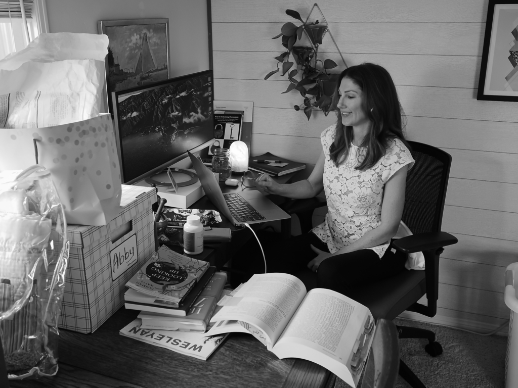 When Catie shared about her latest project, featuring women working from home, in black and white, with all the tools of their trade, I signed up. When I’m not in one tiny corner of my bedroom for my video sessions with clients from all over California, my private practice office comprises the corner of the playroom/ laundry station/ multi-purpose storage dump-all room.